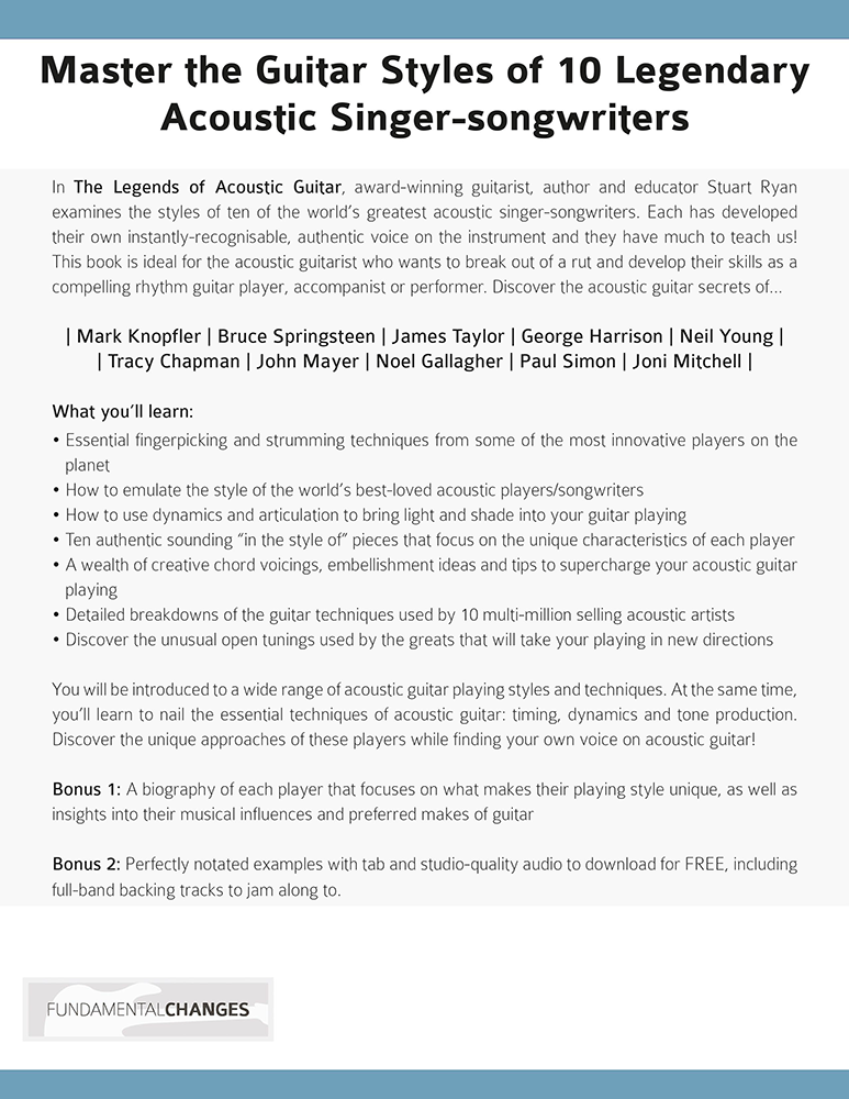 In The Legends of Acoustic Guitar, award-winning guitarist, author and educator Stuart Ryan examines the styles of ten of the world’s greatest acoustic singer-songwriters. Each has developed their own instantly-recognisable, authentic voice on the guitar and they have much to teach us!