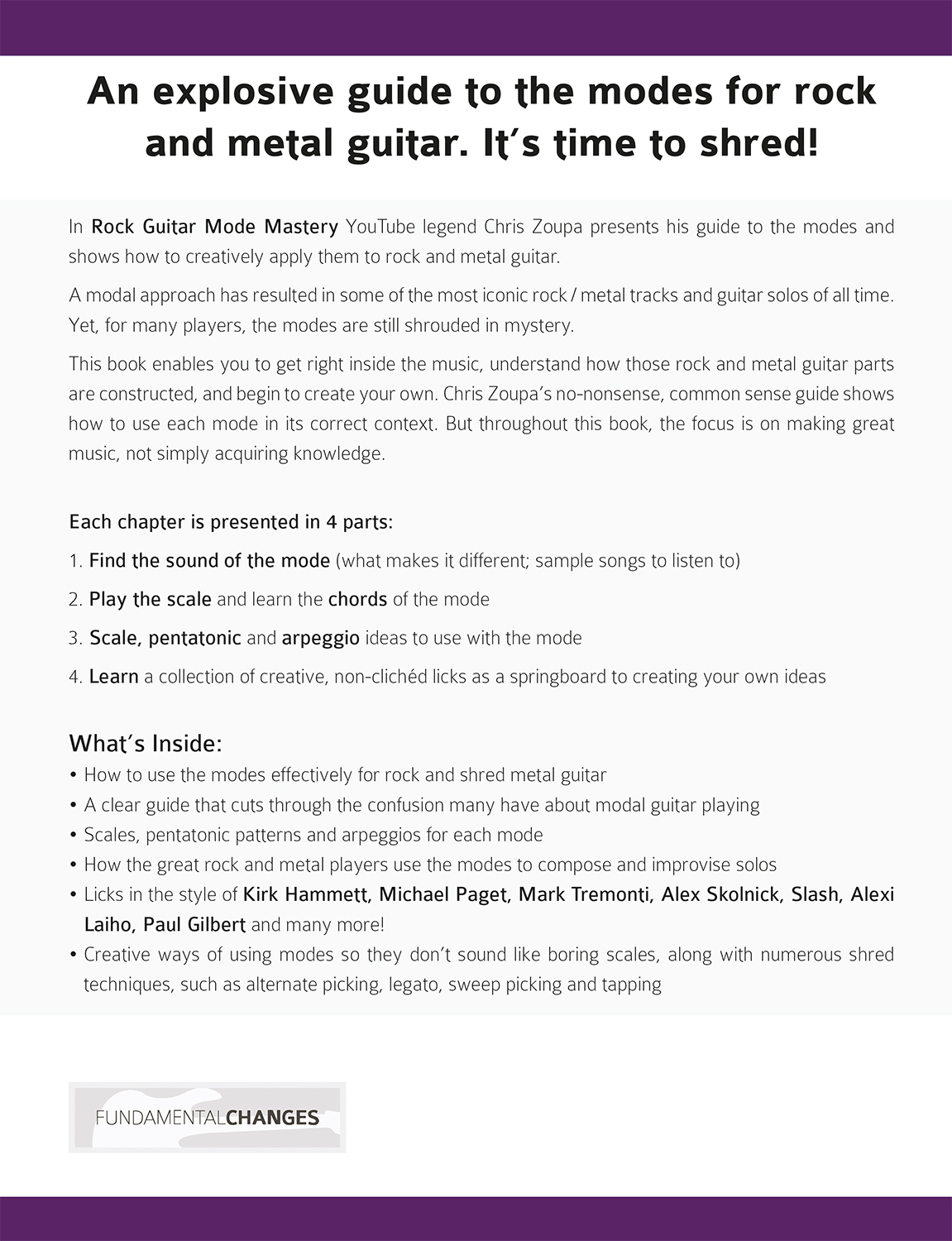 This book enables you to get right inside the music, understand how those rock and metal guitar parts are constructed, and begin to create your own. Chris Zoupa’s no-nonsense, common sense guide shows us how to use each mode in its correct context. But, throughout this book, the focus is on making great music, not simply acquiring knowledge.